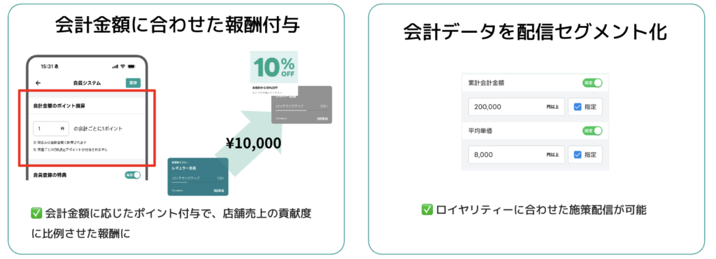 ユビレジと連携することで、会計金額に応じた精度の高いマーケティングが可能になり、ロイヤリティの高いユーザーを効率的に育成できます。