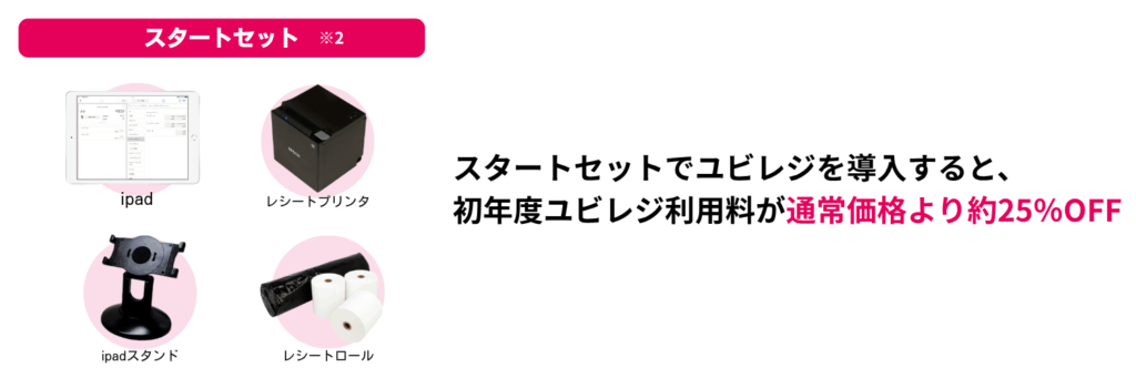 ※2:スタートセットの内容:iPad(レジ端末)1台/レシートプリンタ1台/ iPadスタンド1台/レシートロール紙 1セット